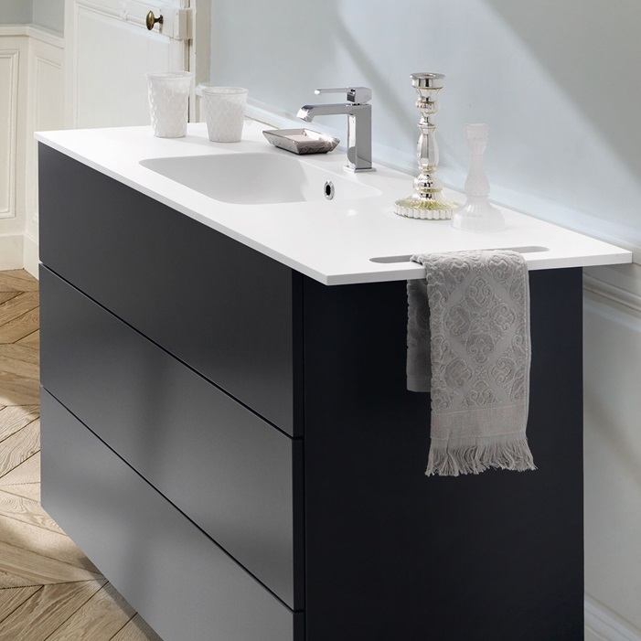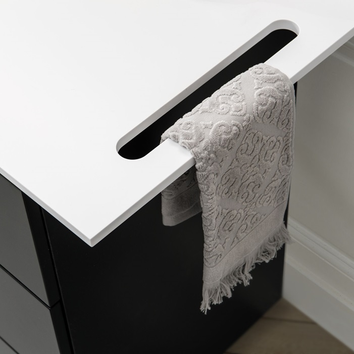 Eine originelle Lösung: Waschtischplatten auf Maß mit Ausschnitt als Handtuchhalter.