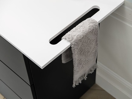 Waschtischplatte aus Cristalplant© mit Ausschnitt-Option für Handtücher.