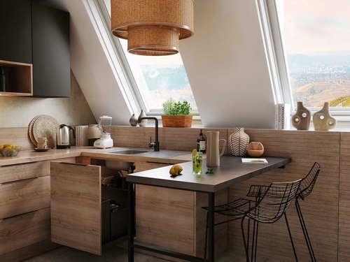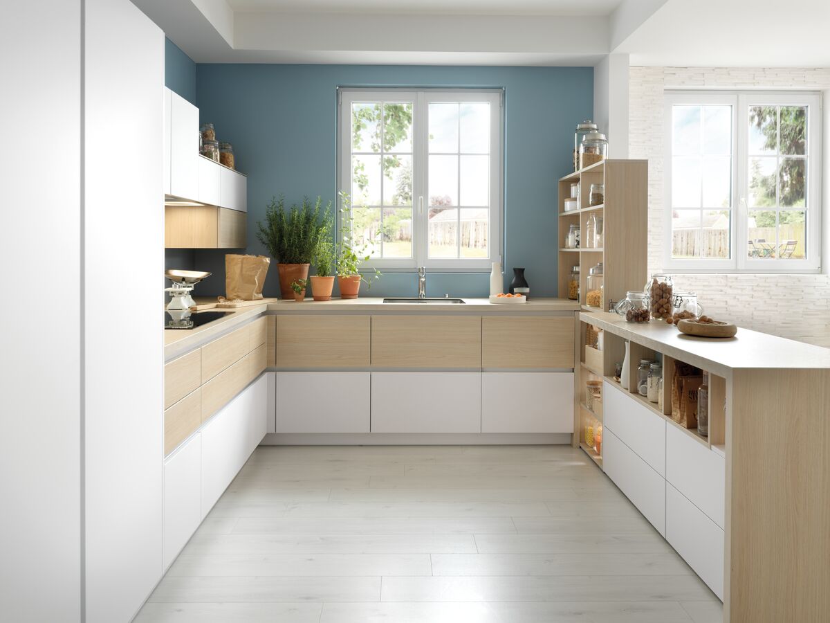 Die neuen Holzserien verkörpern perfekt den Japandi-Stil, der sich von Japan und Skandinavien inspirieren lässt. Der Kontrast zwischen dem Naturholz und den gerillten Fronten unterstreicht die Persönlichkeit der zentralen Kochinsel. Die Arbeitsplatte passt fabelhaft zu den Oberschränken und fügt sich nahtlos in den Raum ein.