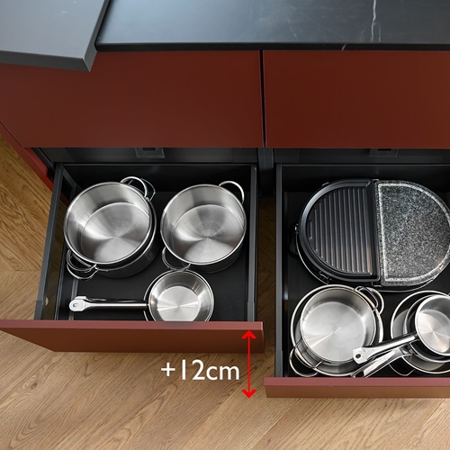 +6 cm = zusätzlicher Schubkasten ohne Aufpreis, macht 33% mehr an Staufläche und bis zu 66% mit Innenschubkasten, lieferbar in alle unseren Auszügen.