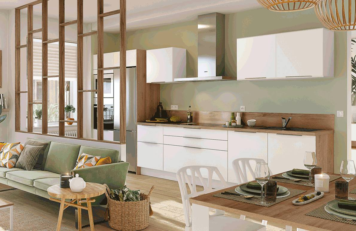 Fijémonos ahora en la cocina moderna firmada por SCHMIDT. En torno a la isla de cocina aparecen módulos de almacenaje de lo más prácticos y electrodomésticos de última generación para completar la cocina completa ideal. La nota de fantasía la traen los tiradores en forma de hoja, los frentes realzados con diseños gráficos o con laca de tacto aterciopelado, que aportan un encanto original a la cocina abierta.