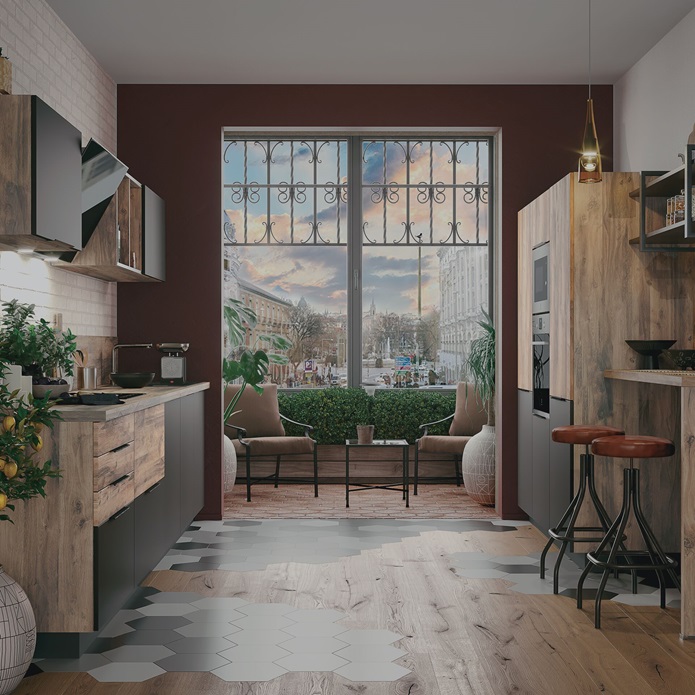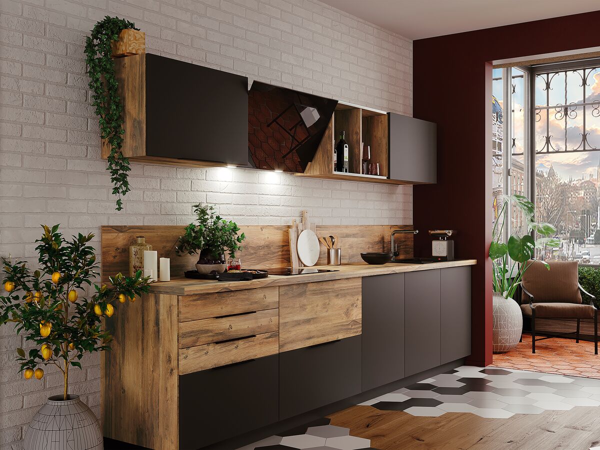 Las nuevas gamas de madera representan perfectamente el estilo Japandi, inspirado en las tendencias de Japón y Escandinavia. En la isla central, el contraste de la madera natural y de la madera ranurada aporta un toque de personalidad indiscutible. La encimera, a juego con los muebles altos, se funde perfectamente en el espacio con total armonía.