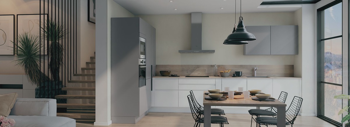 Esta cocina es un espacio de vida para compartir y disfrutar de las mejores recetas. Por eso hemos decidido equiparla con una encimera tipo barra, ideal para 2 personas, creando así una zona para comer íntima y convivial.