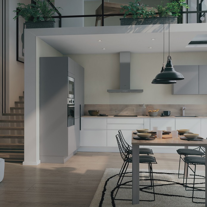 Esta cocina seduce por su estilo nórdico, con elementos gráficos marcados y discretos que se adaptan perfectamente a las limitaciones del espacio. Hemos combinado varios sistemas de apertura de puertas para conseguir una cocina sencilla y práctica. En este proyecto hemos conseguido nuestro eterno desafío: combinar lo bonito con lo práctico.