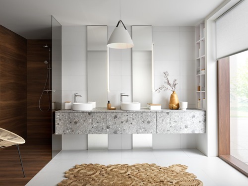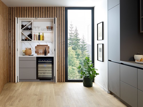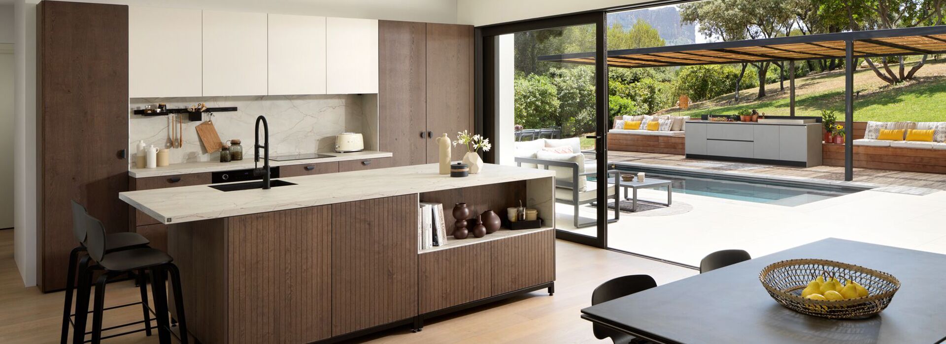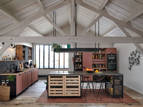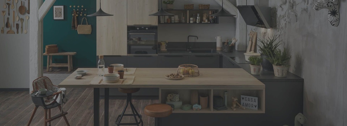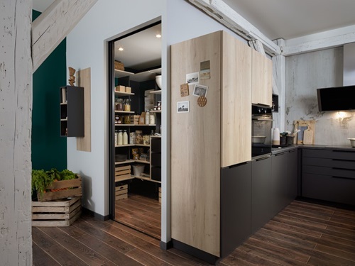 Les nouvelles gammes bois incarnent parfaitement le style Japandi, inspiré du Japon et de la Scandinavie. Sur l’îlot central, le contraste du bois naturel et du bois rainuré apporte une personnalité affirmée. Le plan de travail, assorti aux meubles hauts, se fondent parfaitement dans la pièce, tout en harmonie.