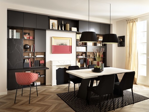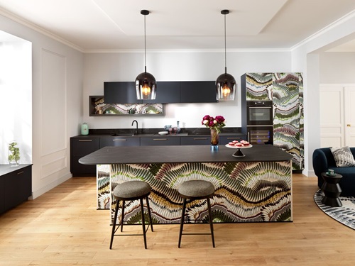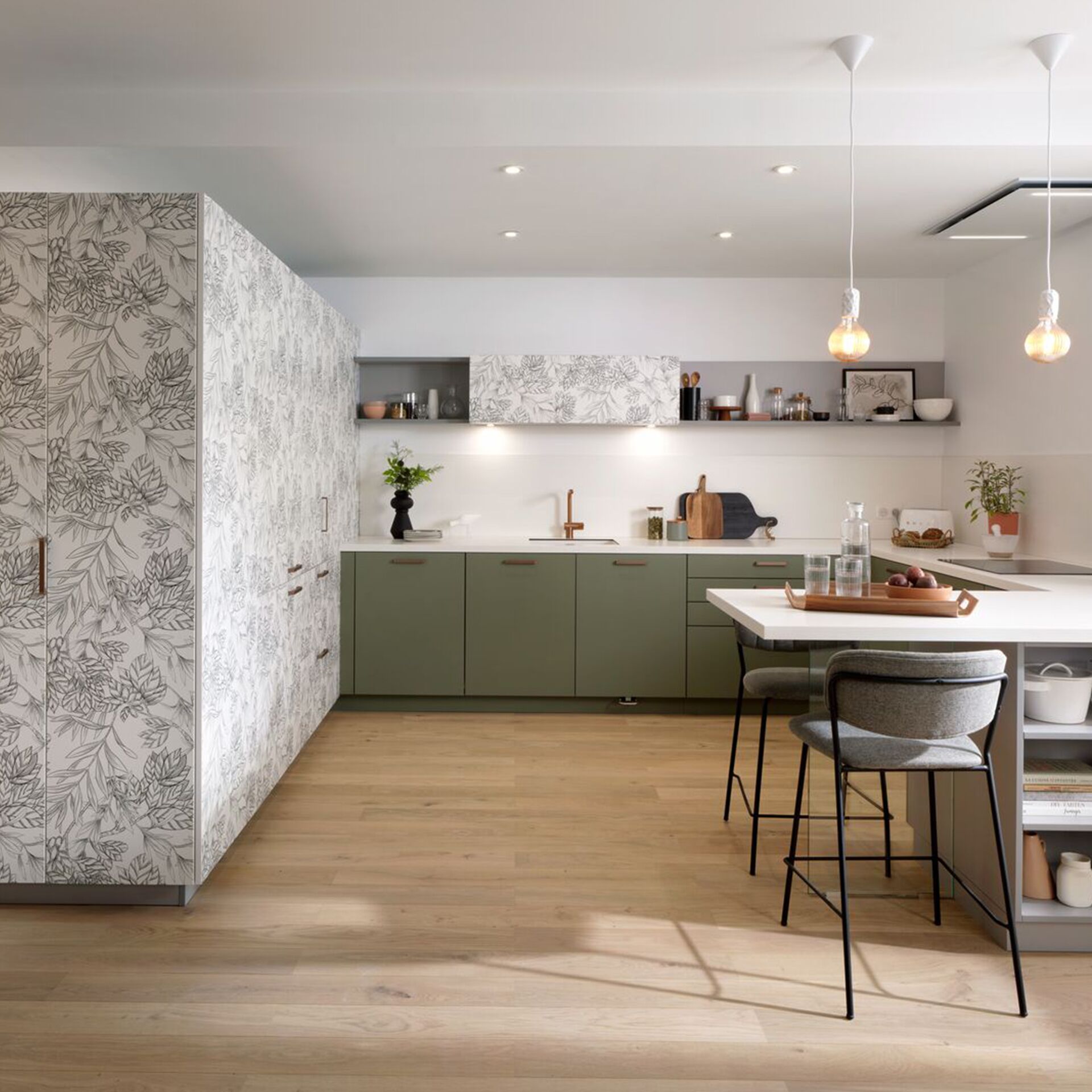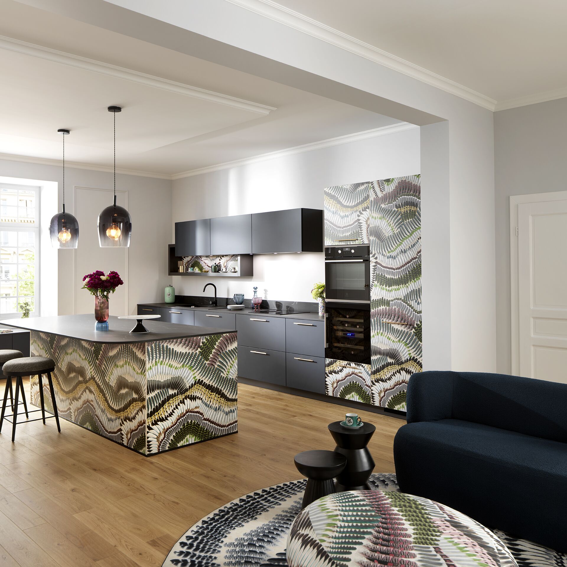 Dans cette belle pièce ouverte, nous avons composé un espace cuisine et un coin bureau grâce à un aménagement monobloc, assorti de multiples rangements. Pour délimiter, sans enfermer, et pour une ambiance originale, nous avons opté pour le décor print Botanic Black, comme une parenthèse de nature dans un univers très urbain.