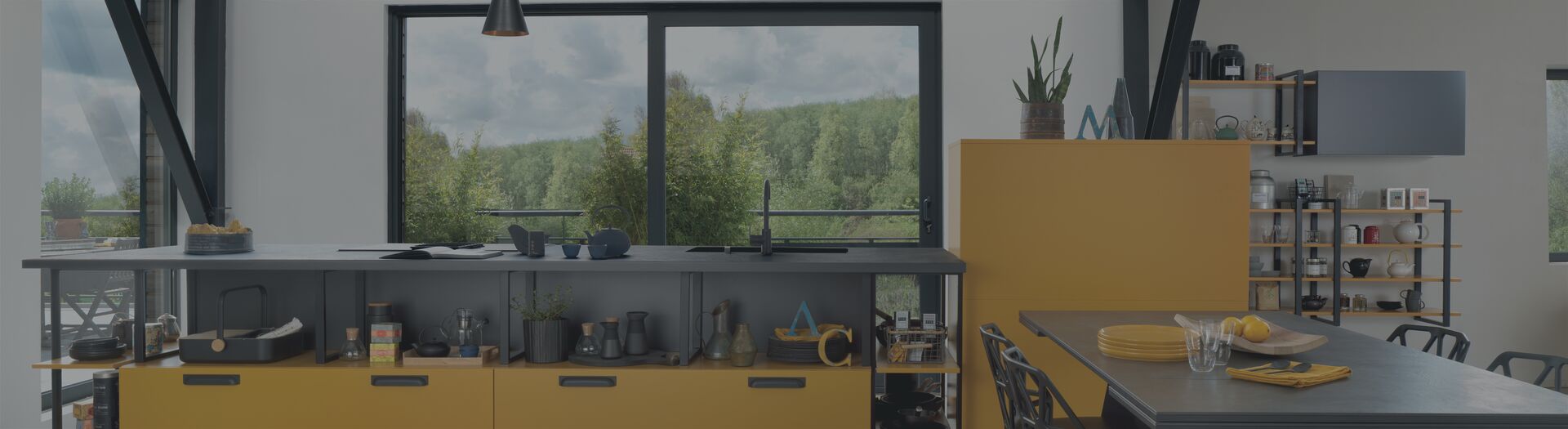 Si au contraire vous avez envie de choisir une couleur de cuisine éclatante, préférez la distribuer à certaines seulement, environ la moitié, comme dans la cuisine jaune et noire Archi Tendance. Vous obtiendrez ainsi le peps recherché sans surcharger visuellement la déco de votre cuisine colorée. La notion d’équilibre est en effet fondamentale lorsqu’il s’agit de déterminer la couleur de sa cuisine. Achetez ensuite de la vaisselle ou quelques pots de la même couleur que vos façades pour faire un élégant rappel sur les étagères ouvertes ou lors du repas !