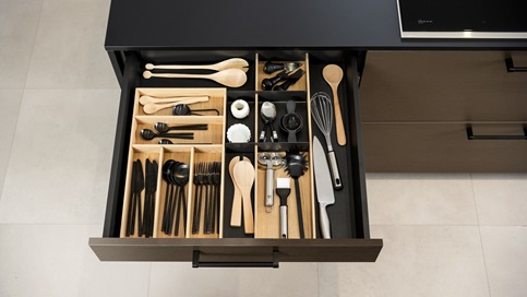 Une cuisine sur-mesure avec des tiroirs ergonomiques, esthétiques et personnalisables. Nos designers vous proposent les solutions qui s’adaptent astucieusement à vos tiroirs, jusqu’à l’éclairage intérieur qui met en scène vos plus beaux couverts. Grâce à Schmidt, chaque objet trouve sa place, toujours accessible et bien rangé. Vous allez adorer.