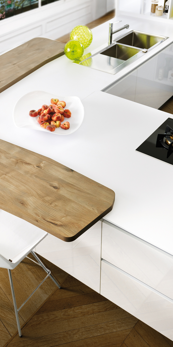 Aspect haut de gamme immédiat : le quartz pose un style, noble, valorisant. En version ultra-fine, il revisite la pierre en mode épuré et s’allie aux cuisines les plus contemporaines. En bloc minéral de 78 mm, son côté statutaire attire le regard et invite à s’y poser – parfait pour un îlot-comptoir. Et quel plaisir d’y abaisser une pâte ! Quel bel écrin minéral, allié à une crédence assortie ! Composé de silice, le plan de travail inno’Quartz se décline en 21 coloris et s’adapte facilement à vos mesures – et pourquoi pas à d’autres matières : du bois pour le réchauffer, de l’inox pour un bel évier… À vous de rêver.