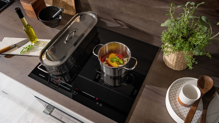 Les sliders individuels et la zone modulable de cette plaque induction Rosières permettent de cuisiner avec un maximum de flexibilité et de rapidité.