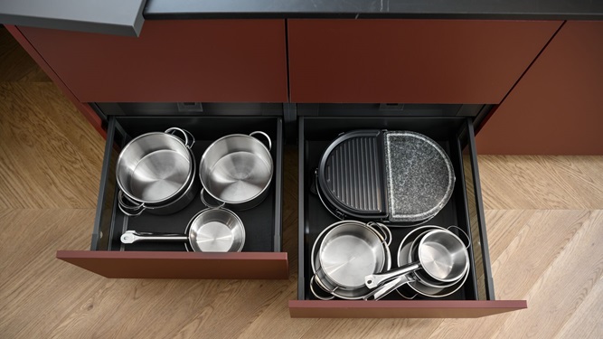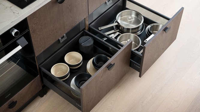Een plaats voor elk voorwerp. Echt maatwerk, een vaste waarde: laden die zich aanpassen aan de breedte van uw vertrek, maar ook aan de grootte van uw accessoires, van de lange deegrol tot de kleinste mokkalepeltjes.