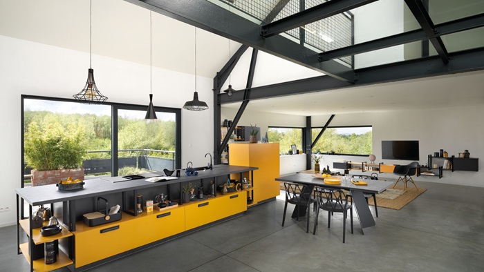 Tussen iedere lade laat een opening zien wat er getoond mag worden, zoals mooie kommen of glazen, terwijl de rest verstopt blijft. De look van een trendy «industrieel meubel», gemoderniseerd met de kleuren van uw keuken of juist niet bij elkaar passend, met meer dan 100 kleuren om uit te kiezen, voor het front en de zijkanten, bijpassend of contrasterend. Uiteraard op maat, in lage of hoge versie, pittig of discreet: dit is hét nieuwe meesterstuk van de design-keuken!